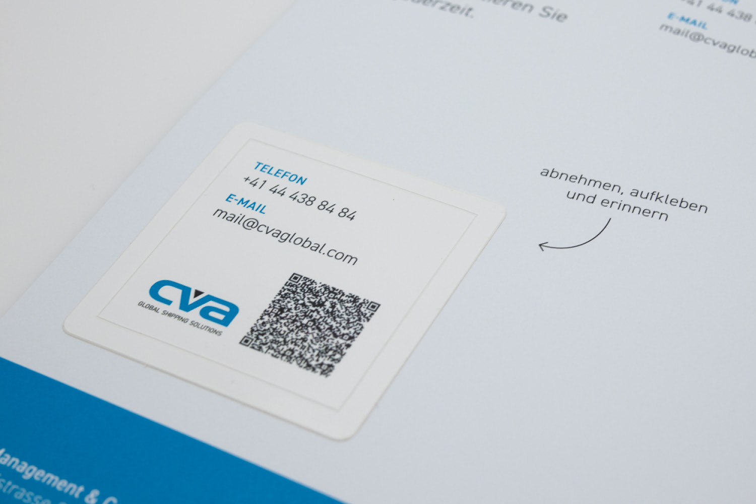 Die CVA Management & Consulting AG mit Sitz in Regensdorf ist Expertin im Bereich von internationalem Transport und Logistik. Wir dürfen das Unternehmen bereits seit einigen Jahren begleiten und habe inzwischen verschiedene Kommunikationsmassnahmen umgesetzt. Um ich Bankensektor potenzielle Neukunden zu erreichen, haben wir einen Flyer entwickelt, welcher passend zur Botschaft mit einem kleine Give Away versendet wurde. Das Lavendelsäcken klebte dabei auf der Innenseite des Flyers. Auf der Rückseite wurde ein Abziehsticker mit QR-Code, welcher die Kontaktdaten enthält, angebracht. Diesen konnten sich die Empfänger bspw. auf Laptop, Mausmatte oder Bürotisch kleben.